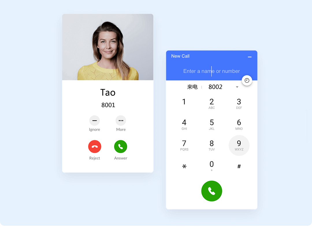 除了电脑端安装软电话使用之外,也可以通话IP话机、移动电话等设备,可满足企业人员移动通信需求。
